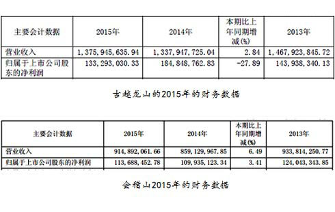古越龙山年报显示,其2015年营收微增2.84%至13.78亿;而会稽山则增长6.49%至9.15亿。