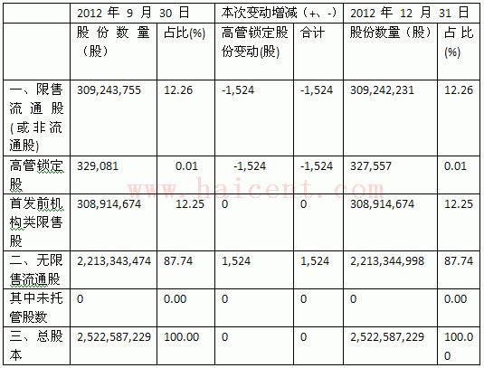 三、前十名股东持股情况(截至 2012 年 12 月 31 日)