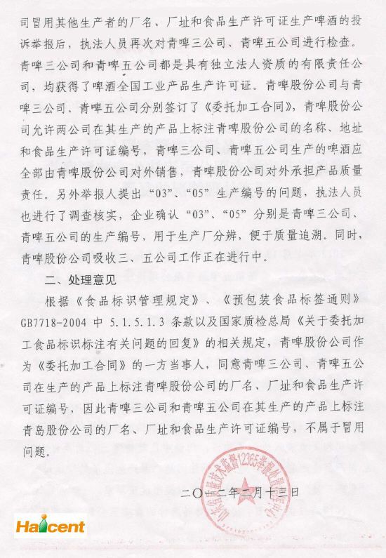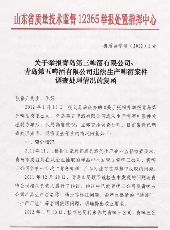 质监局:青啤三公司和五公司产品不属于冒用 2012-04-23