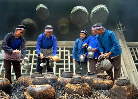 谷物蒸熟后必须迅速、及时冷却到微生物生长繁殖或发酵所需温度,拌上酒曲,放入陶器坛中发酵。在酒曲中微生物的作用下,淀粉开始转化为糖份,酵母菌又进一步将糖转化成酒精,不断产生的二氧化碳使缸内自然升温。然而温度过高并不利于酵母菌的生长繁殖,这时候就需要“酒头脑”——掌握开耙技术的人用听、嗅、尝、摸四种方式,判断是否需要进行搅拌冷却,补充新鲜空气。