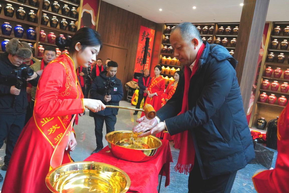 9时58分,封坛大典正式启幕,一系列庄重礼仪尽显镇赉县的民俗文化与待客之道。净手礼环节,嘉宾们以铜盆净手,寄托“洁净待佳酿、赤诚促合作”的共赢愿景;工作人员缓缓启封储存十五年以上的木酒海,醇厚酒香瞬间弥漫全场,浸润着每一位嘉宾的感官;众人共同将53度陈藏原浆注入定制陶坛,鸣锣三声奏响美好祈愿,仪式感拉满;最后,嘉宾们在封条上留名,加盖“镇赉珍藏”福章,以传统礼仪完成封印,定格这一传承与合作的重要时刻。来自黑龙江的企业代表李先生感慨道:“在镇赉县近距离感受非遗酿酒技艺的仪式感与深厚底蕴,不仅领略了独特的地域文化,更看到了这里非遗与产业深度融合的巨大潜力。”