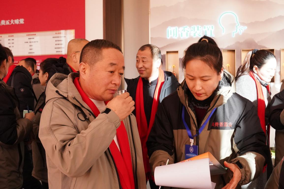 9时许,嘉宾们走进镇赉香酒博馆,通过馆内丰富展品,追溯该品牌自1917年山东王氏家族创号以来,扎根镇赉县百年传承的发展脉络。作为白城市非遗项目核心,“镇赉香酒酿造技艺”不仅是品牌的核心竞争力,更是镇赉县地域文化的重要载体。第六代非遗传承人高彦宝现场演示古法酿酒工序,详细拆解“顶气装锅慢、缓火蒸馏稳、掐头去尾准”的技艺秘诀,并重点介绍了东北独有的红松木酒海储酒工艺——内壁裱百层桑皮纸,以蛋清、鹿血调和密封,让原浆酒在自然陈化中沉淀出独特香气,这一承载着镇赉县酿酒智慧的工艺,引得嘉宾驻足细品、连连称赞。